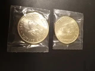 Se vende moneda de 100 pesetas españolas, conmemorativas del Mundial de fútbol de España 82 y del Rey Juan Carlos I. Una moneda muestra el logo del mundial y otra el retrato del rey.