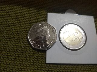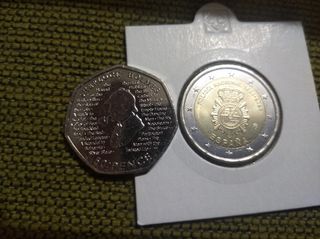 Se vende lote de dos monedas. - Una moneda conmemorativa de Sherlock Holmes, 2019, 50p. - Una moneda de 2 euros de la Policía Nacional de España (1824-2024).