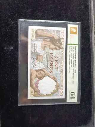 Billete de 100 Francos de Francia, emitido por el Banco de Francia en 1940. Se encuentra en una funda protectora. - Pick: 94 - Moneda: 100 Francos - Año: 1940 - Grabado por: BdF - Firmado por: Pierre Rousseau & René Favre-Gilly - Marca de agua: Mercurio & Ceres - Número de serie: U.11543 618 - Calificación: 64 Choice Uncirculated