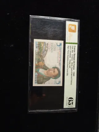 Billete de 5 Francos de Francia, emitido por el Banco de Francia en 1933. Este billete está clasificado como Choice Uncirculated con una puntuación de 64. - Año: 1933 - Denominación: 5 Francos - País: Francia - Emisor: Banque de France - Pick: 72e - Marca de agua: Cabeza de Guerrero - Firmado por: Félix Boyer & Pierre Strohl - Número de serie: A.55384 136 - Calificación: 64 Choice Uncirculated