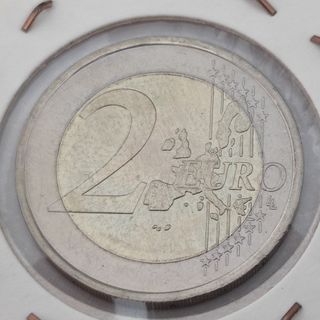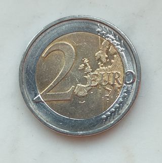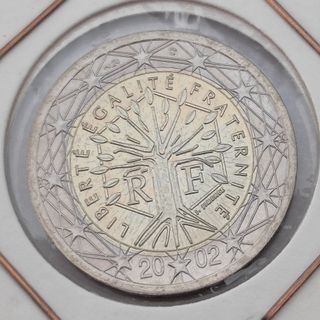 Moneda de 2€ del año 2000 de Francia, ya no se encuentran en circulación desde este año y tiene un fallo de acuñado en la zona plateada donde las estrellas están cortadas al haberse movido la plancha al acuñarla. Precio negociable. Escucho ofertas.