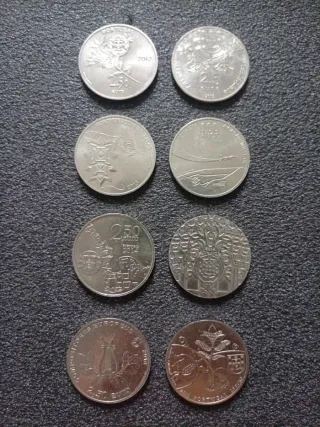 Conjunto de monedas antiguas de Portugal. Cada pieza presenta diseños y grabados característicos de la numismática portuguesa. Colección de unas 40 monedas portuguesas auténticas, desde finales del siglo XIX hasta los años 90. Incluye piezas de 100 Réis, monedas de 1, 5, 10, 20 Escudos, y varias conmemorativas de 25, 100, 200 y 500 Escudos con diseños históricos y figuras como poetas, barcos y símbolos nacionales. Monedas en buen estado general, con algunas antiguas mostrando pátina del tiempo. Ideal para coleccionistas, decoración o iniciarse en la numismática portuguesa.