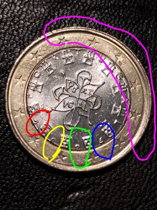 Moeda de 1 Euro de Portugal, emitida em 2024. -Moeda com 9000 de cunhagens Erros de cunhagens - Circulo vermelho o 2 está cortado ao meio. -Circulo Amarelo o "0" está cortado ao meio. -Circulo verde o "2" está cortado ao meio. -Circulo Azul o "4" está sem a perna final. -Circulo rosa a moeda não tem o corte uniforme