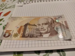 Billete o se cambia 5 Lari de Georgia. El billete muestra un retrato y un edificio. - Serie: AA49477924 - Año: 2021 - Denominación: 5 Lari - País: Georgia