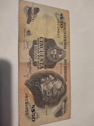 Billete de 50 Nuevos Pesos de Uruguay, emitido por el Banco Central. - Denominación: 50 Nuevos Pesos. - Serie: F. - Número de serie: 08728915. - Ley N° 14.316.