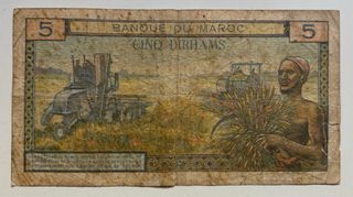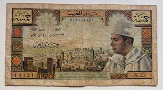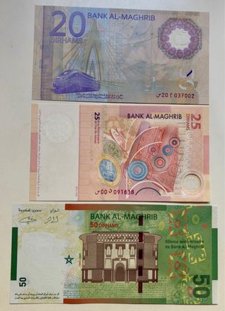 Conjunto de tres billetes conmemorativos de Marruecos. Incluye los valores de 20, 25 y 50 dirhams.
