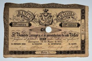 Este es un billete histórico del Banco de Zaragoza con fecha de 14 de Mayo de 1857. - Valor: Cien (100) reales vellón. - Número de serie: 02513. - Serie: A. - Emitido en Zaragoza. Tengo más artículos similares MIRAD MIS ANUNCIOS , Envio fotos washap o correo preguntad sin compromiso. Envio por wallapop y tambien por correo ordinario / Certificado a todo el Mundo . ( Mas Articulos en Ebay Y Todocoleccion Pedir Enlace) Alguna duda preguntar sin compromiso .