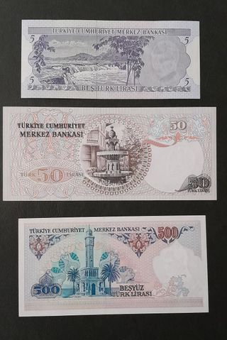 Conjunto de 7 billetes de Lira Turca. - Billetes de 5, 50, 500,10000, 20000, 50000 y 100000 Liras. - Incluyen retrato de Atatürk. - Diseños detallados.