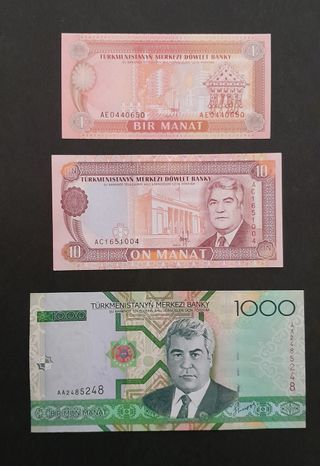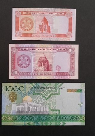 Conjunto de billetes de Turkmenistán. - Billetes de Turkmenistan de 1 Manat, 10 Manat y 1000 Manat. -Billetes de Irán de 20, 1000 y 10000 Rials. -Billete de 25 Dinars de Irak y 200 Dinar de Yugoslavia. Billetes Sin Circular.