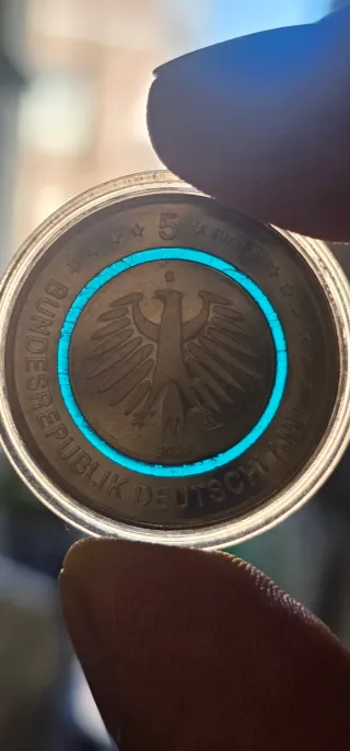 Moneda de 5 euros de Alemania con el águila federal. - Diseño de la República Federal de Alemania. - Año de acuñación: 2020. - Borde con estrellas de la Unión Europea.