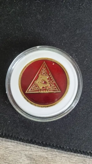 Moneda con un diseño distintivo. - Fondo rojo brillante. - Borde dorado. - Símbolo de un triángulo con un león estilizado en dorado en su interior. - Detalles celtas en el triángulo.