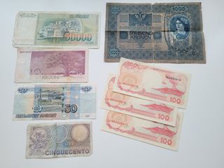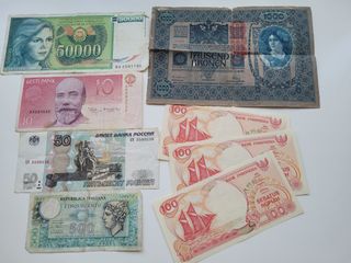 Colección de billetes antiguos de diferentes países. Incluye billetes de Yugoslavia, Indonesia, Estonia, Rusia, Italia, y Austria. Los tre billetes de Indonesia en perfecto estado SC (sin circular) precio por todos - Tres billetes 100 rupias de Indonesia. - Billete de 50.000 de Yugoslavia. - Billete de 10 Krooni de Estonia. - Billete de 50 Rublos de Rusia. - Billete de 500 Liras de Italia. - Billete de 1.000 Korona de Austria.