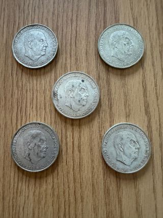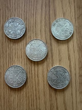 Conjunto de cinco monedas de cien pesetas de plata, acuñadas en 1966. - Diseño con escudo y corona. - Inscripción 100 PTAS y año 1966. - Material: plata 80% - El precio total, es por 30€ la unidad.