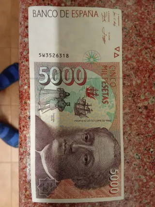 Billete de 5000 pesetas del Banco de España, emitido en 1992. Presenta la imagen de Cristóbal Colón. - Serie: 5W3526318 - Fecha de emisión: 12 de octubre de 1992 - Denominación: Cinco Mil Pesetas