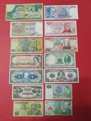 Colección variada de billetes de diferentes países. - Billete de 5000 de Yugoslavia. - Billete de 100 Pesos de Argentina. - Billete de 2 Dólares de Canadá. - Billete de 1 Cruzado de Brasil. - Billete de 1 Dólar de Japón. - Billete de 20 Escudos de Portugal. - Billete de 1 Leu de Rumanía. - Billete de 5000 de Uruguay. - Billete de 50 Pesos de Chile. - Billete de 100 Zaire de Zaire. - Billete de 10 Kronor de Suecia. - Billete de 5000 de Camboya. Más lotes en el perfil!!! No envío por Boyacá!