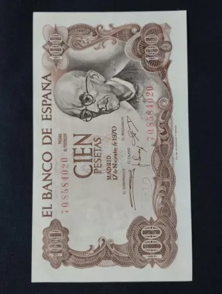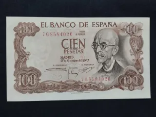 Billete de 100 pesetas del Banco de España, emitido en Madrid el 17 de noviembre de 1970. Sin circulación para coleccionismo. - Serie: 7Q8584020 - Denominación: Cien Pesetas - Fecha de emisión: 17 de Noviembre de 1970