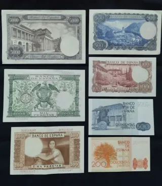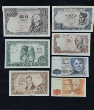 Conjunto de billetes antiguos de España sin circulación en condiciones perfectas. - Billetes de 5000, 1000, 500, 100 y 200 pesetas. - Diseños variados con retratos históricos y figuras emblemáticas. - Emitidos por el Banco de España en diferentes años.