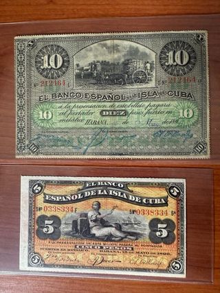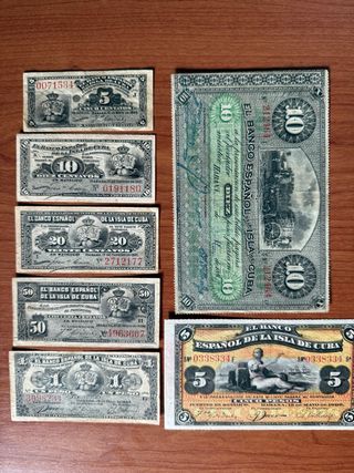 Conjunto de siete billetes del Banco Español de la Isla de Cuba. - Incluye billetes de 5, 10, 20, 50 centavos y 1 peso. 5 y 10 pesos. - Diseños variados con escudos y escenas. - Fechas de emisión visibles en algunos billetes. 1896-1897