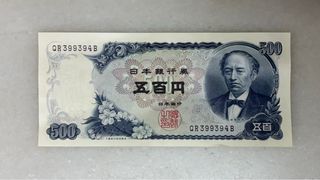 Billete de 500 yenes de Japón. - Serie QR399394B. - Inscripción 日本銀行券 (Billete del Banco de Japón) y 五百円 (Quinientos yenes).