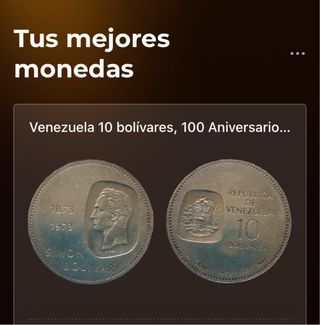 Moneda de colección de Venezuela. - Denominación: 10 bolívares. - Conmemoración: 100 Aniversario. - Anverso: Retrato de Simón Bolívar. - Reverso: Escudo de Venezuela.