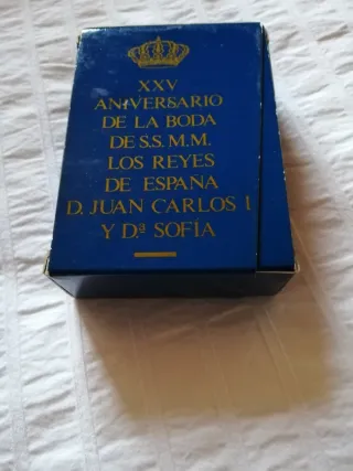 Conmemorativas monedas del XXV Aniversario de la Boda de los Reyes de España, Don Juan Carlos I y Doña Sofía. - Diseño conmemorativo. - Texto: XXV ANIVERSARIO DE LA BODA DE S.S. M.M. LOS REYES DE ESPAÑA D. JUAN CARLOS I Y Dª SOFÍA. - Incluye corona real.