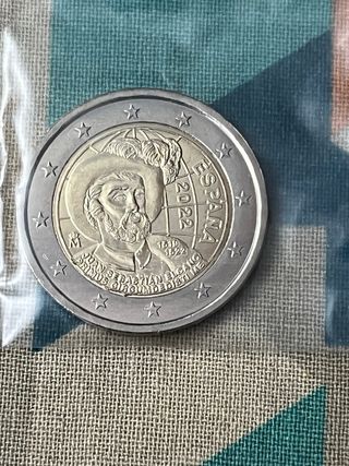 Moneda conmemorativa de 2 euros de Eslovaquia. 2022 - S/C. De rulo Banco Nacional. - Diseño dedicado al programa Erasmus. - Imagen de un globo terráqueo y un personaje histórico.