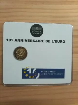Moneda conmemorativa de 2 euros de Francia, emitida en 2012 para celebrar el 10º aniversario del Euro. Coincard - Diseño especial del Monnaie de Paris. - Incluye el texto 10e ANNIVERSAIRE DE L'EURO. - Presentada en un estuche conmemorativo. - BILLETS ET PIÈCES LES DIX PREMIÈRES ANNÉES.
