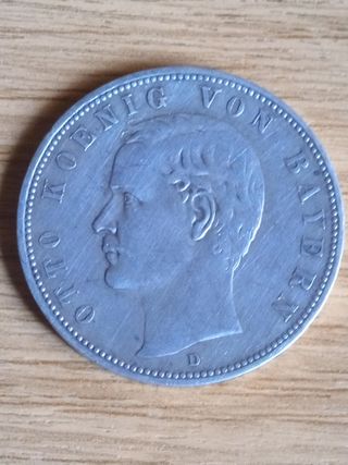 Moneda de plata del Imperio Alemán de 1902. - Canto con inscripción. - Diseño del águila imperial. - Valor de 5 Mark. - Peso: 27,68 g. - Material: Plata ley 900. - Rey: Otón I de Baviera. - Ceca: Munich. -Referencia: KM#915.