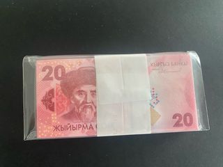 Lote de 100 billetes de 20 Som de Kirguistán, año 2009. - Cada billete tiene un valor nominal de 20 Som. - Año de emisión: 2009. - País de origen: Kirguistán.