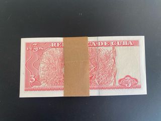 Conjunto de 100 billetes de 3 pesos cubanos del año 2005. - Diseño con retrato de Ernesto Che Guevara. - Serie FB-04. - Emitidos por el Banco Central de Cuba.