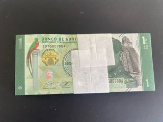 Fajo de 100 billetes de 1 Quetzal de Guatemala, emitidos en 2023. Cada billete presenta el diseño oficial. - Serie B01680780A. - Incluye la imagen del Quetzal y el retrato de Maria Orellana. - Denominación: 1 Quetzal.