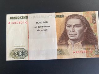 Fajo de 100 billetes de 500 Intis de Perú, con fecha de emisión 26 de junio de 1987. - Serie A 4357801 Q. - Fecha de impresión: 29.08.88.