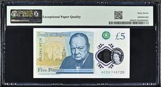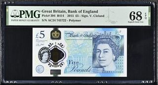 Billete de 5 Libras Esterlinas de Gran Bretaña, emitido por el Banco de Inglaterra en 2015. Certificado por PMG con una calificación de 68 EPQ (Superb Gem Uncirculated). - Pick# 394 B414 - Firma: V. Cleland - Serie: AC24 745722 - Material: Polímero