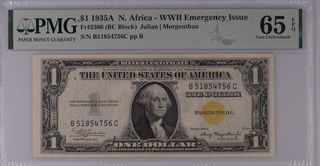 Billete de un dólar de Estados Unidos, serie 1935-A, con diseño de emergencia para el Norte de África durante la Segunda Guerra Mundial. Certificado por PMG con calificación 65 Gem Uncirculated. - Fr#2306 (BC Block) - Firmado por Julian y Morgenthau - Número de serie: B51854756C pp B