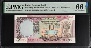 Billete de 10 rupias de la India, emitido en 1979 por el Reserve Bank of India. Certificado por PMG con una calificación de 66 EPQ (Gem Uncirculated). - Serie: 50L 845636 - Firma: #85 - Letter B - Año: ND (1979)