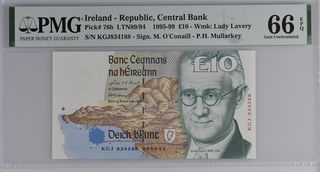 Billete de 10 libras de Irlanda, República, Banco Central, emitido entre 1995 y 1999. Presenta el retrato de Lady Lavery. - Grado PMG: 66 EPQ (Gem Uncirculated). - Pick#: 76b. - Firma: M. O'Conaill - P.H. Mullarkey. - Marca de agua: Lady Lavery. - Número de serie: KGJ834188.
