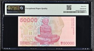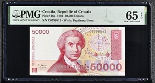 Billete de 50.000 Dinara de Croacia, emitido en 1993. Certificado por PMG con una calificación de 65 EPQ (Gem Uncirculated). - Pick# 26a - S/N C6596813 - Marca de agua: Baptismal Font