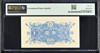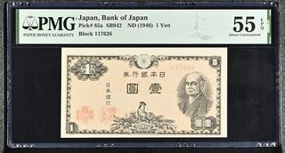 Billete de 1 Yen de Japón, emitido en 1946. Certificado por PMG con una calificación de 55 EPQ (Exceptional Paper Quality). - País: Japón - Denominación: 1 Yen - Año: 1946 - Calificación PMG: 55 EPQ - Pick #: 85a SB942 - Bloque: 117626