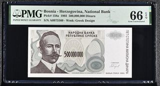 Billete de 500.000.000 Dinara de Bosnia, emitido en 1993. Certificado por PMG con una calificación de 66 Gem Uncirculated. - Pick# 158a - S/N A0975560 - Wmk: Greek Design - Diseño: Petar Arkonich 1672-1916 - Lugar de emisión: Banja Luka 1990.