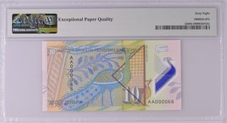 Billete de 10 Denari de Macedonia del Norte, emitido en 2020. Certificado por PMG con una calificación de 67 Superb Gem Unc. - Denominación: 10 Denari - Año: 2020 - País: Macedonia del Norte - Emisor: National Bank - Material: Polymer - Calificación PMG: 67 EPQ Superb Gem Unc - Número de serie: AC000066