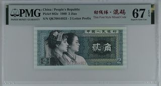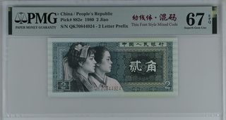 Billete de 2 Jiao de la República Popular China, emitido en 1980. Certificado por PMG con una calificación de 67 EPQ (Superb Gem Unc). - Pick# 882e - S/N QK70844923 - Código de fuente delgada mixta