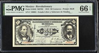 Billete de 50 Centavos de México, emitido en 1915 durante la Revolución. - Calificación PMG: 66 EPQ (Gem Uncirculated). - Serie: C 89004. - Estado Libre y Soberano de Sinaloa. - Impresor: B&R.