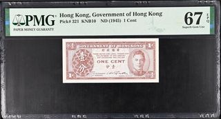 Billete de 1 Cent de Hong Kong, emitido por el Gobierno de Hong Kong en 1945. Certificado por PMG con una calificación de 67 EPQ (Superb Gem Uncirculated). - Diseño con retrato. - Texto en inglés y chino. - Calificación de conservación: 67 EPQ.
