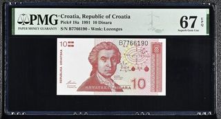 Billete de 10 Dinara de Croacia, emitido en 1991. Certificado por PMG con una calificación de 67 EPQ (Superb Gem Unc). - País: Croacia, República de Croacia - Pick #: 18a - Año: 1991 - Denominación: 10 Dinara - Número de Serie: B7766190 - Marca de Agua: Lozenges