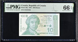 Billete de 100 Dinara de la República de Croacia, emitido en 1991. Certificado por PMG con una calificación de 66 EPQ (Gem Uncirculated). - País: Croacia - Año: 1991 - Denominación: 100 Dinara - Calificación PMG: 66 EPQ (Gem Uncirculated) - Número de Pick: 20a - Número de Serie: C8419104