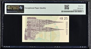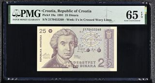 Billete de 25 Dinara de la República de Croacia, emitido en 1991. Certificado por PMG con una calificación de 65 EPQ (Gem Uncirculated). - Pick# 19a - S/N 2170453268 - Marca de agua: 5's en líneas onduladas cruzadas