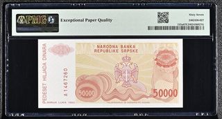 Billete de 50.000 Dinara de Bosnia y Herzegovina, emitido por el Banco Nacional en 1993. Certificado por PMG con una calificación de 67 EPQ (Superb Gem Uncirculated). - Denominación: 50.000 Dinara - Año: 1993 - País: Bosnia y Herzegovina - Emisor: Banco Nacional - Calificación PMG: 67 EPQ (Superb Gem Uncirculated) - Pick #: 153a - Marca de agua: Diseño Griego