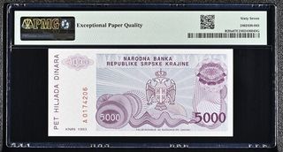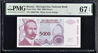 Billete de 5000 Dinara de Bosnia, emitido por el Banco Nacional en 1993. Certificado por PMG con una calificación de 67 EPQ (Superb Gem Uncirculated). - Pick# 152a - S/N A0661760 - Wmk: Greek Design