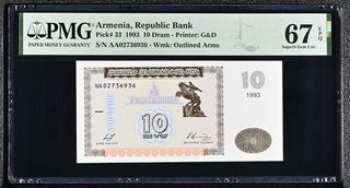 Billete de 10 Dram de Armenia, República Banco, emitido en 1993. Certificado por PMG con una calificación de 67 EPQ (Superb Gem Uncirculated). - Pick# 33 - Impresor: G&D - Marca de agua: Brazos contorneados - Número de serie: AA02736936