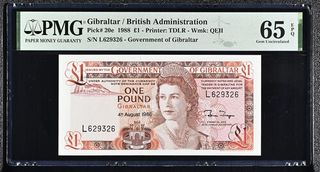 Billete de 1 Libra de Gibraltar de 1988, certificado por PMG con una calificación de 65 EPQ (Gem Uncirculated). - Emitido por el Gobierno de Gibraltar. - Pick# 20e. - Marca de agua: QEII. - Número de serie: L629326. - Fecha de emisión: 4 de agosto de 1988.